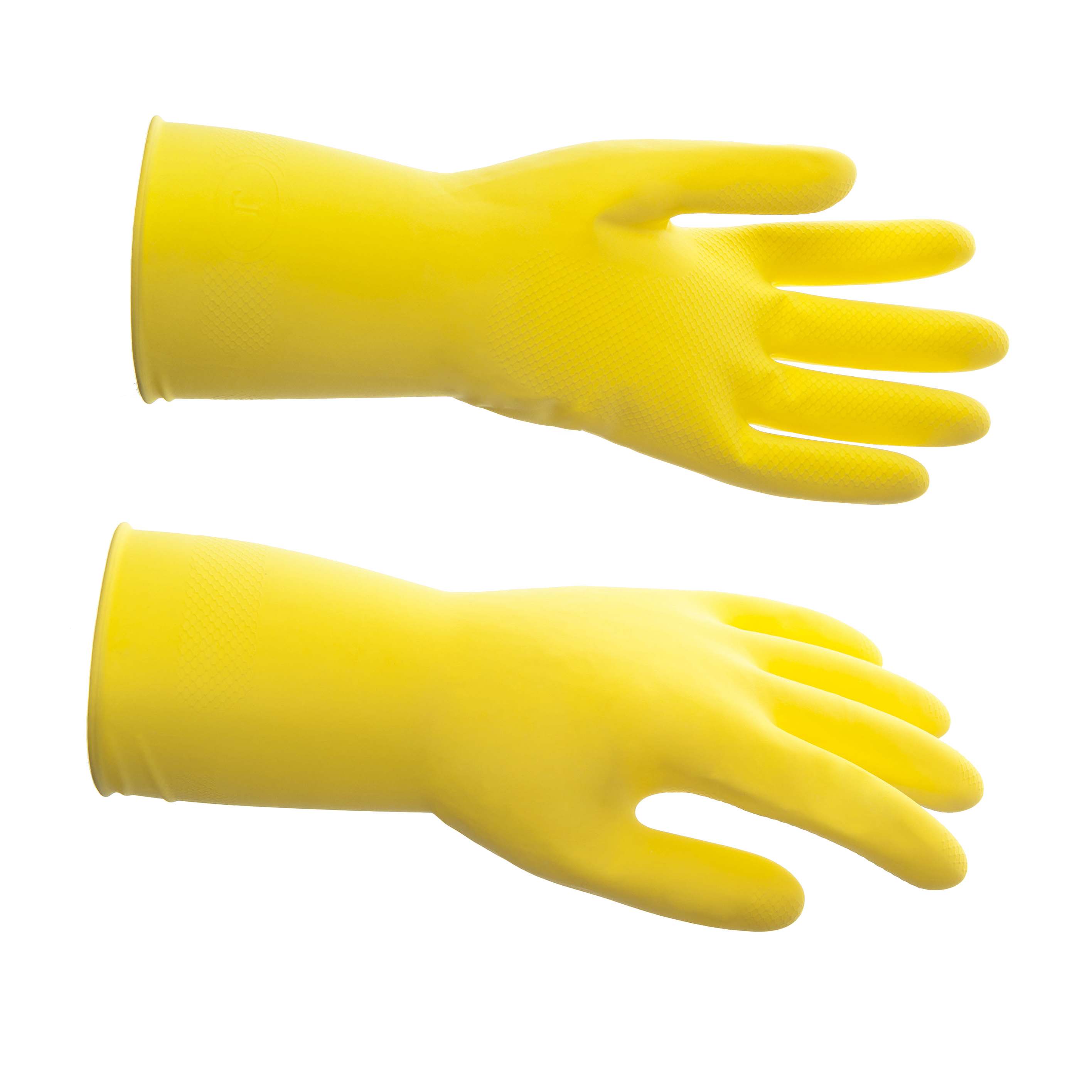 Перчатки резиновые L желтые.Материал: латекс 70%, добавки 30%; размер: 320х120х4 мм.Соответствуют I категории - защита от механических факторов; имеют антискользящий рельеф на пальцах и ладони, хлопковое напыление.Соответствуют нормам CE, ЕАС.